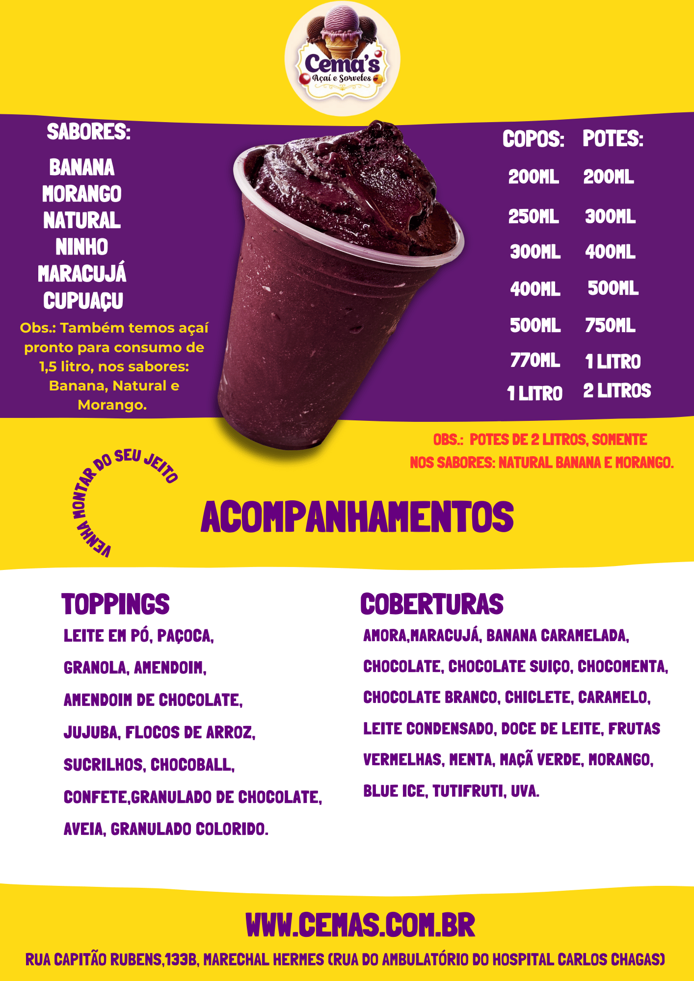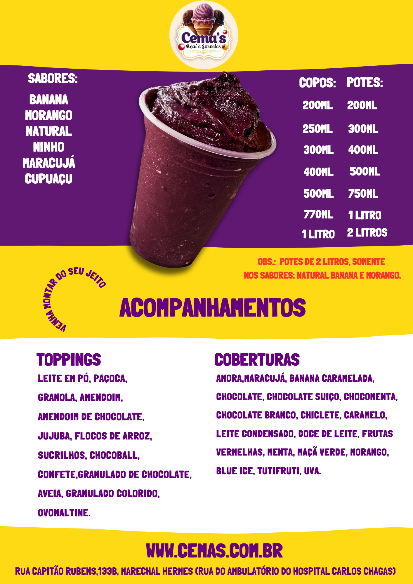 Na Cema's Açaí e Sorvetes, cada sabor é preparado com ingredientes de alta qualidade e com o cuidado que você merece. Venha experimentar e descubra o seu sabor preferido!