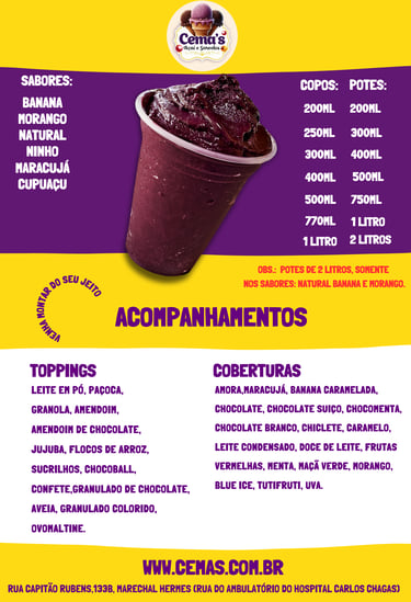 Experimente nossos açaís cremosos com toppings variados, nos deliciosos sabores: